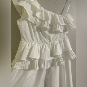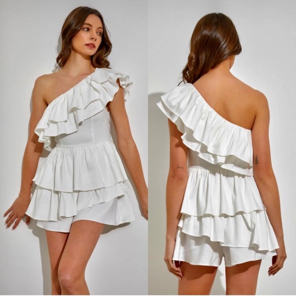 Elegant one-shoulder romper. Features layered ruffles. Perfect for a chic look.