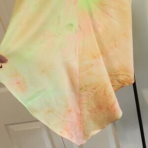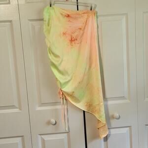 Fun & beautiful asymmetrical skirt. Side ruching that can be tightened or loosened with a drawstring. Other side has a zipper & hook & loop closure. Silky feeling.