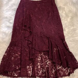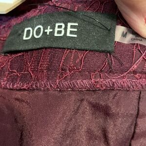 DO+BE TWO PIECE MEDIUM LACE SKIRT/TOP SET in purple. These pieces are new with tags. Top has scalloped edge around the bottom and around the sleeves. The top is lined only in the front. The back is completely lace. The skirt is lined all around mini size. Smoke free and pet free home. I also have this two piece set in size small - separate post
