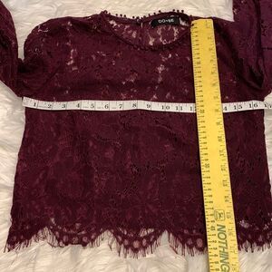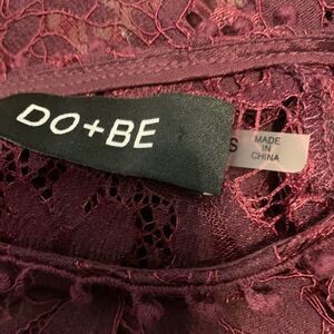 DO+BE TWO PIECE SMALL LACE SKIRT/TOP SET in purple. These pieces are new with tags. Top has scalloped edge around the bottom and around the sleeves. The top is lined only in the front. The back is completely lace. The skirt is lined all around mini size. Smoke free and pet free home. I also have this two piece set in size medium - separate post