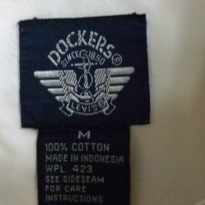 DOCKERS FOR LEVIS - 2 front pockets/one with logo, off/white (light cream color) men styled, button down shirt, 2 adjustable button/cuff sleeves, vintage, G/W: gently worn, very good condition. [pit/pit=22"~length=30"] Runs a little large/looser fit.