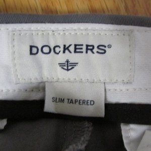 DOCKERS MEN'S SIZE 28 X 30 PANTS EASY KHAKI GRAY SLIM FIT ALL MOTION COMFORT NWT. Fabric: 64% Cotton, 34% Polyester, 2% Elastane. Tag says 28 x 32, but actual measurements are listed below. 4 pocket trouser style dress pants. Zip front fly with intact and working metal zipper. Variegated gray 4 hole button closure on waistband. Embroidered Dockers logo above right back pocket. on back waistband. 6 belt loops. Gray top stitching. The pictures show the exact item you are purchasing. ** Color may be slightly off due to monitor color setting/flash of camera **.