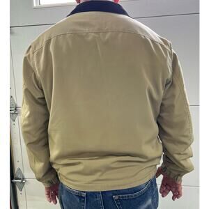 This DOCKERS Men's Fleece-Lined Jacket is perfect for the winter, fall, and spring seasons. The jacket features a solid beige color with a polyester outer shell material and polyester lining material. It has a zip closure and is a size M. The jacket is pre-owned.