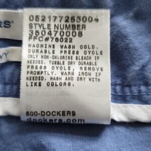 DOCKERS cargo shorts. Style is called mid rise curvy. Khaki. Two functioning front and two back pockets with buttons. One small additional front pocket with button closure. Button and zip closure. Stretch in material. The color of these is a faded blue color.
