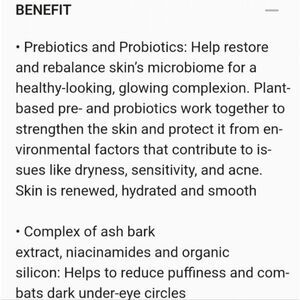 The eye cream with prebiotics & probiotics, hyaluronic acid and a complex of ash bark extract, niacinamides and organic silicon intensively moisturizes, helps to reduce puffiness and conceals dark circles while optically smoothing out irregularities and redness around the eyes.