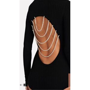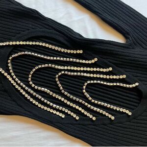 Keywords: DODO BAR OR, black bodysuit, women's fashion, open back, rhinestone chains, ribbed pattern, evening wear, cocktail party, size 12, pre-owned.