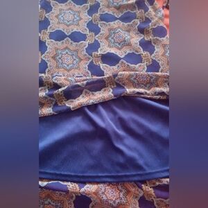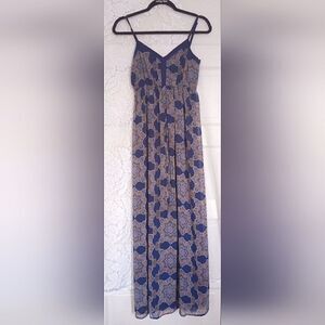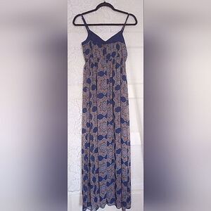 Aztec-like designs on blue background, blue trimmed bustline, adjustable spaghetti straps, fully lined, polyester blend, measures 53 inches long, 15 inches armpit to armpit, EUC