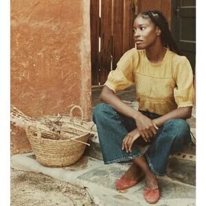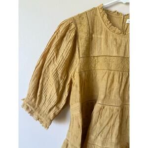 In 100% organic cotton voile, the DÔEN Adnet Top romances with rows of pintucks and ladder stitches on the yoke, sleeves, and interspersing its blossom-embroidered tiers. Lace trims the round neckline, short puff sleeve cuffs, and hem of this feminine piece
