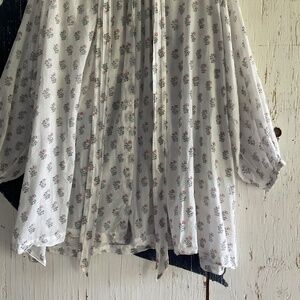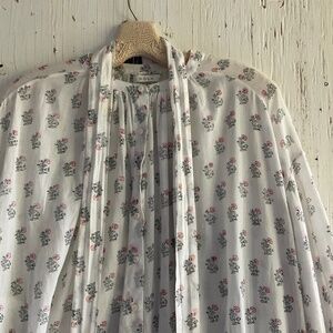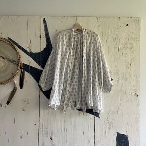 Beautiful flowy super soft organic cotton dress with sash belt, a button off the front and on the cuffs, billowy draping with dropped shoulders. This red Dahlia block print is super sweet and super lightweight. Perfect for super warm months over a swimsuit, as a dress with nude bra and high waisted panties or a doen short nude slip, it also could be worn as a top or as a duster over a tank top and shorts. It’s a super versatile piece to have in your wardrobe..