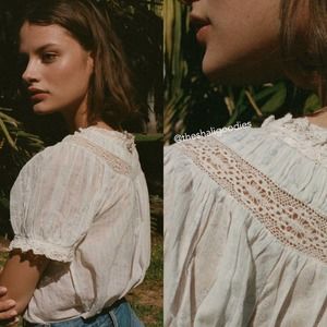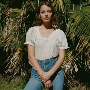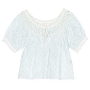 DOEN Misty Top White Blue Floral Lace Trim Cotton Blouse