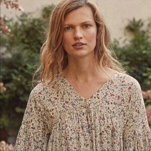 In a sandwashed silk, the Pietra dress is a confection of autumnal romance. A v-neck and a rectangular drop shoulder seam add a touch of structure to this free-flowing style. Full, voluminous sleeves are gathered into the full shoulder and billow freely to an elastic cuff at the wrist. The floaty body is gathered into the yoke seam across the fitted front, leading to a flowing floral and paisley print that cascades to a mini-length hem