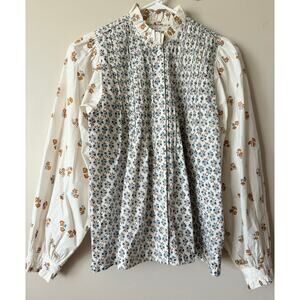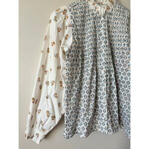 In the softest 100% organic cotton, the Silene top in an elevated take on the classic Springtime style decorated with heritage Indian block printing techniques. The loose, unstructured shape echoes the classic styling of an artist’s smock top, with V-shaped pintucking to add texture to the bodice and back and full-length sleeves gathered into the shoulders and ruffled button cuffs. Contrasting florals on the sleeve, neckline and body add sophistication while mother of pearl buttons down the center make this an endlessly adaptable staple piece you'll return to again and again.