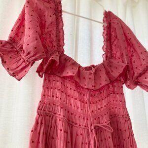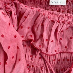 Lightly worn DÔEN Sol Dress in Tea Rose, size Small. Features a smocked bodice with a square neckline and ruffle details. Made from lightweight, organic cotton.