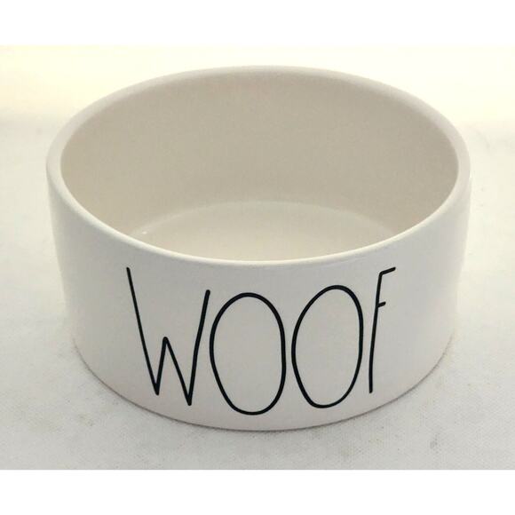 Nice larger size dog food/water bowl. This is done by Rae Dunn. It has the word "WOOF" in the typical Rae Dunn lettering. It is a light crem color ceramic bowl. It is 6" diameter and is 2.75" high. Nice bowl for your favorite dog.