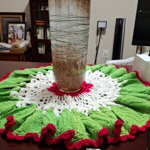 DOILY (X-LGE) crocheted with red, white and green yarn.