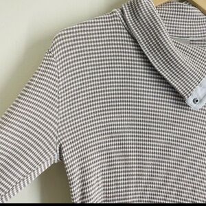 Stylish long sleeve top with a unique button collar. Features a striped pattern in cream and gray.