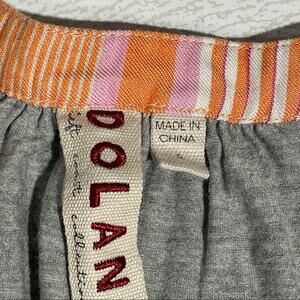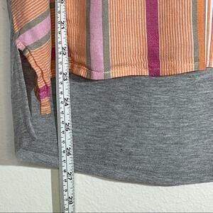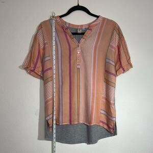 DOLAN Hi-Lo Cut Striped Short Sleeve Linen Blend Shirt Size Small. Coral and pink striped shirt. Gray on the back. Rolled short sleeves. Material on the front is a linen and rayon blend. Material on the back is rayon and spandex. Please see pics for measurements.