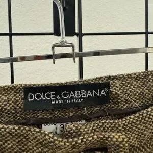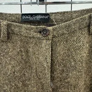 Beautiful designer tweed pants with bold leaf patterns in leather and soft fabric. Crafted by Dolce & Gabbana. Wide leg. Dead stock. Hard to find.