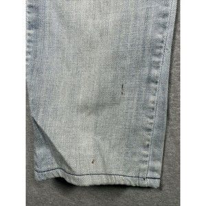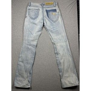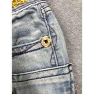 These pants have been altered, hemmed, staining at the bottom of the pants. Missing jewels on the side of the pants, and the front button. Some of the blue embroidery is starting to get damaged, as well as the gold embroidery on the belt loops are damaged.