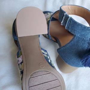 DOLCE by mojo moxy Floral Embroidered denim peep toe ankle strap heels, back zipper, pompoms on the zipper, never been worn, size 6.5, in excellent condition
