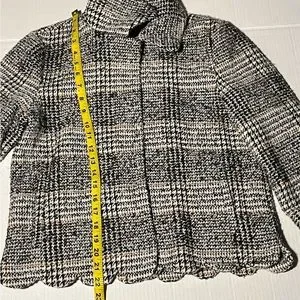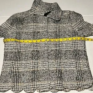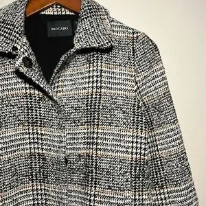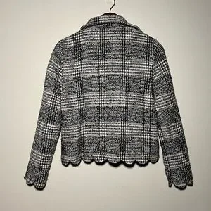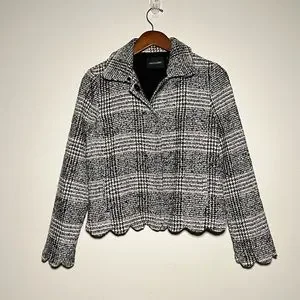Women’s Size Small Dolce Cabo Neutral Gray & Tan Houndstooth Print, Boxy, Wool Blend, Tweed Blazer With A Scalloped Hemline.
