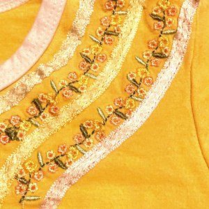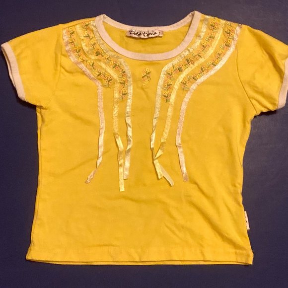 Up for your consideration is a very nice little girls' short-sleeved shirt from Dolce Donna. It is a deep yellow color with white edging on the neckline and arm openings. It features floral embroidery and ribbon detailing on the front, and it is STRETCH for a perfect fit. 92% cotton, 8% spandex, size 3T, and in Excellent condition.