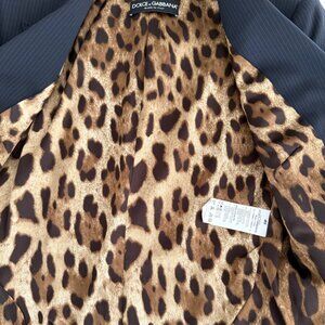 DOLCE & GABBANA BLACK PINSTRIPED SINGLE BREASTED BLAZER - SIZE IT 40- notch lapel, long sleeves, single breast pocket, two front flap pockets, fitted seaming, fully lined signature leopard 97% poly, 3% elastane, button cuffs, single vent in back, fabric is 54% poly, 44% wool, 2% elastane - sleeves 24", Length 26", Shoulders 14.5", Bust 34" EXCELLENT CONDITION
