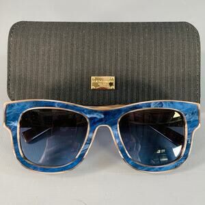 DOLCE & GABBANA sunglasses in a blue and brown acetate featuring an all over marbled pattern, full rimmed design, and blue tinted lenses. Comes with case. Made in Italy.