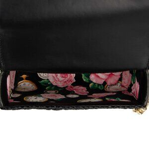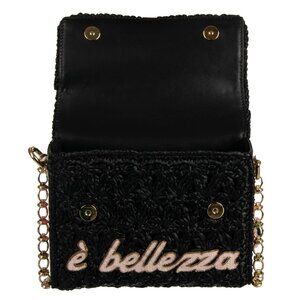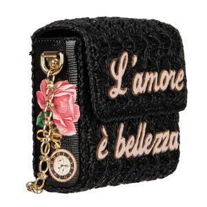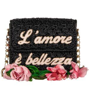 EXCEPTIONAL CONDITION!! DOLCE & GABBANA MILLENNIALS L'Amore e Bellezza WOVEN CROSSBODY. Interior: Slot for mirror, logo print, Chain strap with flowers on the leather handle, Embroidered "L'amore e bellezza" lettering on the front, Floral print on the sides, Light gold hardware. (L x W x H): approx. 17.5 cm x 5.5 cm x 14 cm