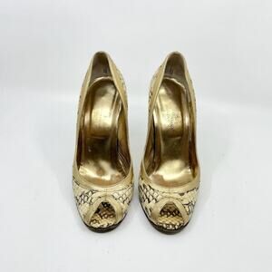 Details: Designer piece from DOLCE & GABBANA, these classic snakeskin peep toe heels with gold leather trim and gold leather interior are sexy, daring, and just appropriate enough to wear at work or on a night out. Made in Italy