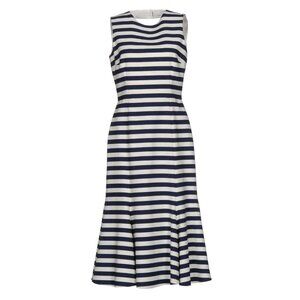 Unique Features: Flattering Open Back Striped Cotton Blend Midi Dress. Embellished with Contrasting Buttons on the Back. Fully Lined. Hook Fastening Keyhole at Back. Concealed Zip Fastening Along Back. Fluted Flounce Hemline. THE LISTING IS FOR THE WHITE BLUE STRIPE VERSION OF THE DRESS. OTHER PHOTOS ARE INCLUDED TO SHOW HOW THE DRESS FITS ON A BODY