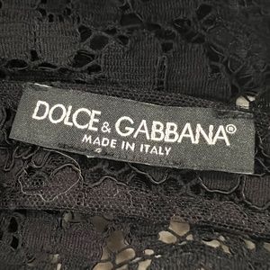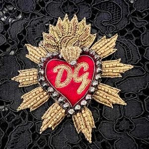 This beautiful Dolce Gabbana blouse has intricate lace with a rounded neckline. It is embellished with the iconic Dolce Gabbana sacred heart embroidered logo on the front in gold metallic threads on top of the red felt heart, and encrusted metal studs.