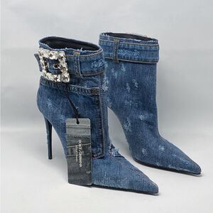 DOLCE & GABBANA Patchwork denim ankle boots with rhinestone buckle