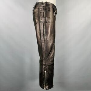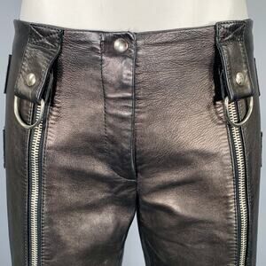 DOLCE & GABBANA SS2000 casual pants in a black leather fabric featuring belt loops with large silver tone D-rings, full zippers on front of each leg, and metal zip closures on calves and sides. Made in Italy.