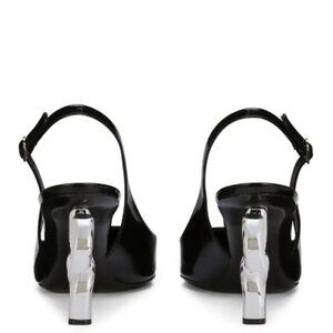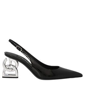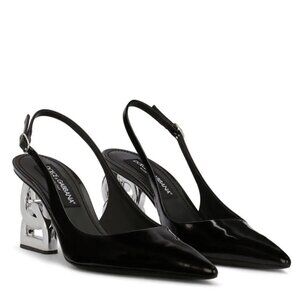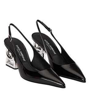 Dolce & Gabbana slingbacks in shiny leather. Heel in the shape of a metallic logo, pointed model.