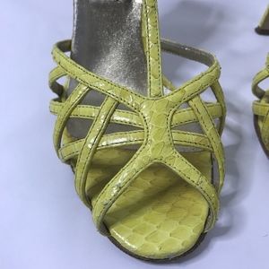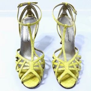 Dolce & Gabbana T strap ankle strap heels sandals. Snake print from real snakeskin. Yellow color. Ankle buckle strap. Caged design on front. Made in Italy.