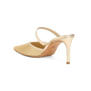 lightly cushioned footbed, continental heel, strap detail, goring detail for stretch, metallic finish, textured finish
