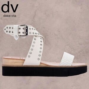 DOLCE VITA White Panko Leather Croc-Embossed Grommet Platform Sandals