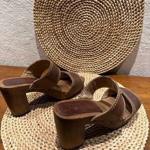 Chic brown leather wooden heels with a comfortable fit. Ideal for casual outings.