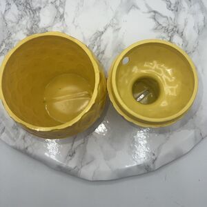 Plastic pineapple cup or piggy bank. Has a slit for coins at the top or a straw hole on the side of the lid. Measures 7.5”H x 5”W. Excellent condition.