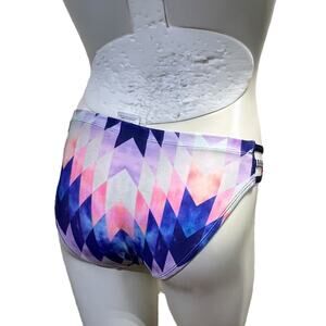 Stylish and functional Dolfin performance bikini bottom featuring a striking geometric pattern in pink, navy blue, and purple with contrasting striped side details.