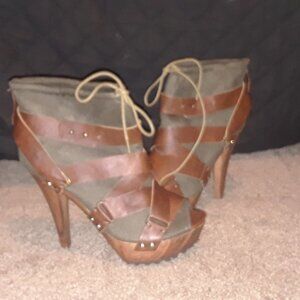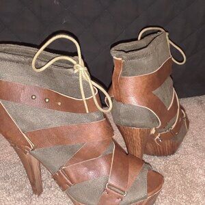 ARMY GREEN SUEDE , BROWN LEATHER CRISS CROSS STRAPPED OPEN TOE BOOTIES\