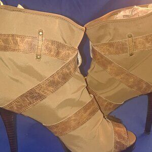 TAN SUEDE , BROWN LEATHER CRISS CROSS STRAPPED OPEN TOE BOOTIES\