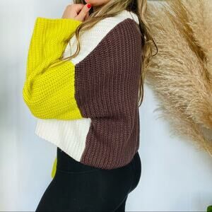 DOLLS KILL BLUE BLUSH White Brown Yellow Colorblock Chunky Knit Cozy Sweater S
