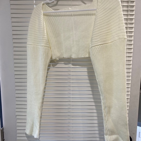 Worn once, this cardigan has a knit ribbed construction, long sleeves, an open front, and a super cropped fit. One size.