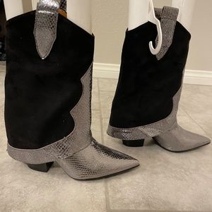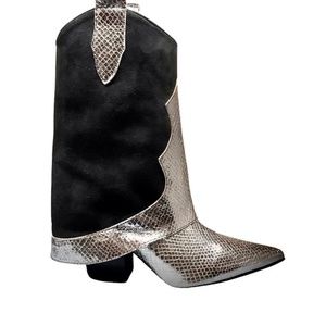 Elevate your western style with our black Texan boots. These boots combine the classic elegance of black with bold, modern details. The turned-up cuff adds a touch of oringiness, while the silver snake print lends a touch of glamour, surely these shoes are a must-have in one's closet. handcrafted by expert artisans