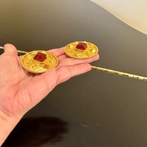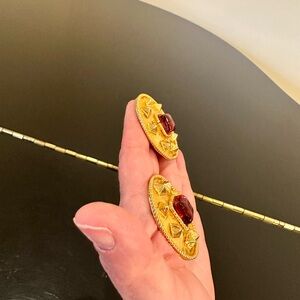 -multiple layers of gold plated brass, meticulously hand crafted in France, pyramid stud, beaded & hammered detail, beautiful large red GRIPOIX stones used in very high end designer jewelry like Chanel
