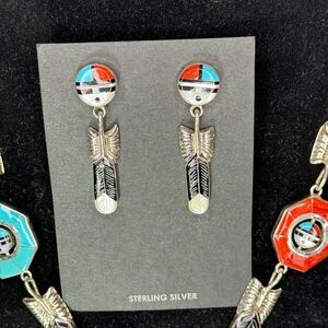 Zuni artist Don Dewa has a very unique style. His inlay art many times is filled with spinning Surfaces, just like the ones you find going up the sides of this unique necklace. One side is a classic Zuni Sunface and the other is a combination of the colors, blue, black, and red. All set in Sterling Silver. Don used Mediterranean Coral, Acoma jet, and Sleeping Beauty Turquoise to make this necklace with sunface, feather earrings. He also incorporates an etched feather on each side of the necklace that adds lots of Native American inspiration to the handmade creation. Don Dewa work is very collectible, and this will be a great addition to your inlay collection.