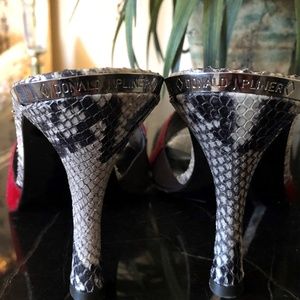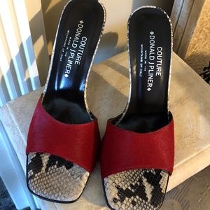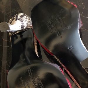 New in box, never worn. Dark red/burgundy upper and python heel and lining. Heel, 4".