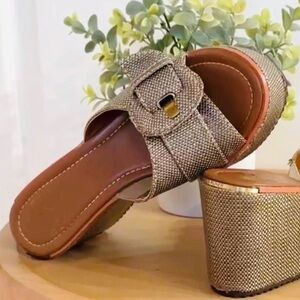 Featuring a rich brownish-gold hue, these sandals blend comfort and sophistication with a stylish 3-inch heel and textured woven design.